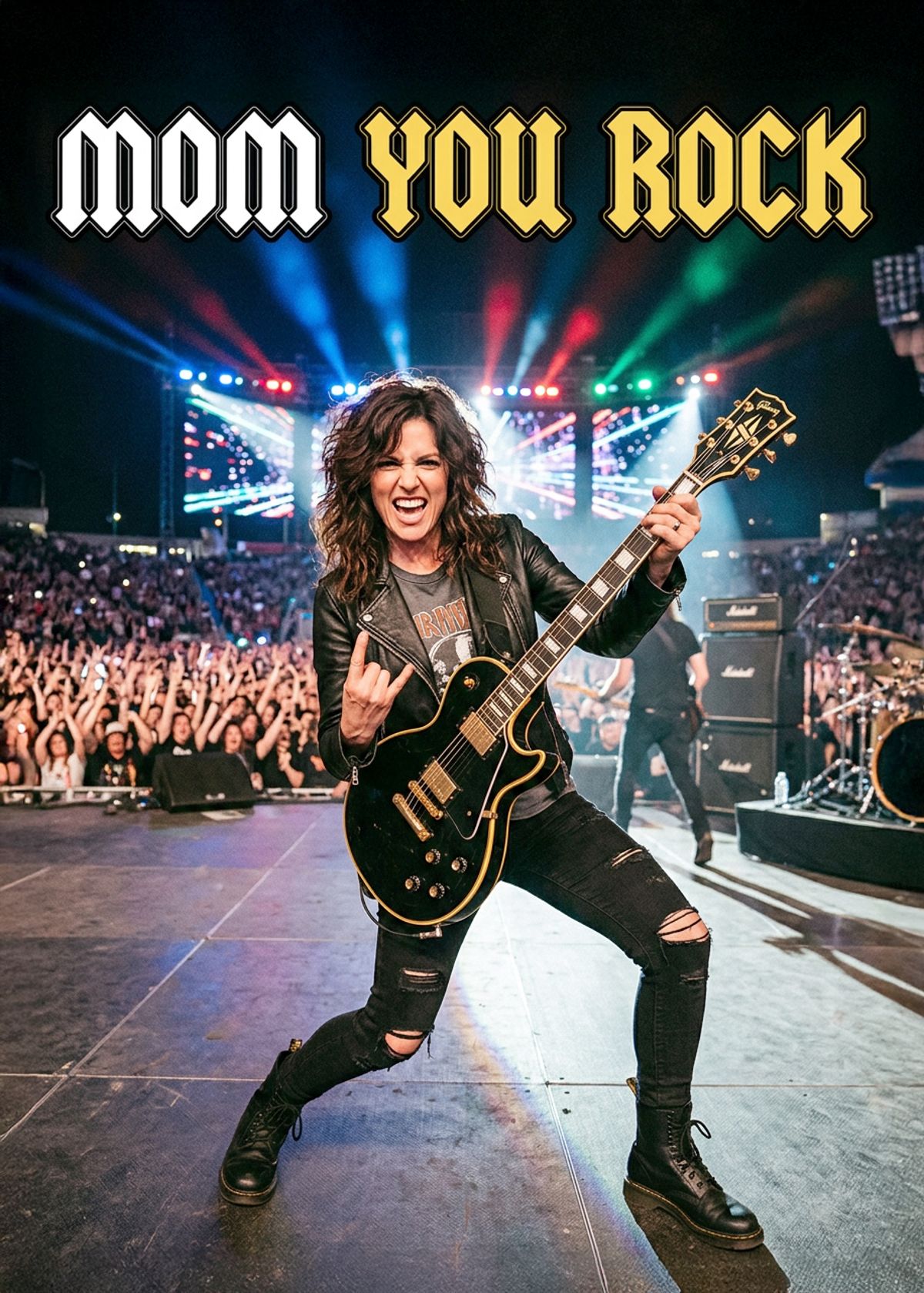 No encore needed. Swap her face onto this crowd-pleasing guitar scene and give Mom the arena moment she deserves.